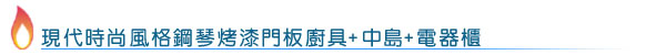 配件:豪山牌微晶調理爐, 喜特麗落地烘碗機, 漏斗型排油煙機, 廚下工作燈, TARIS 緩衝美鐵抽屜, 伸縮水龍頭...